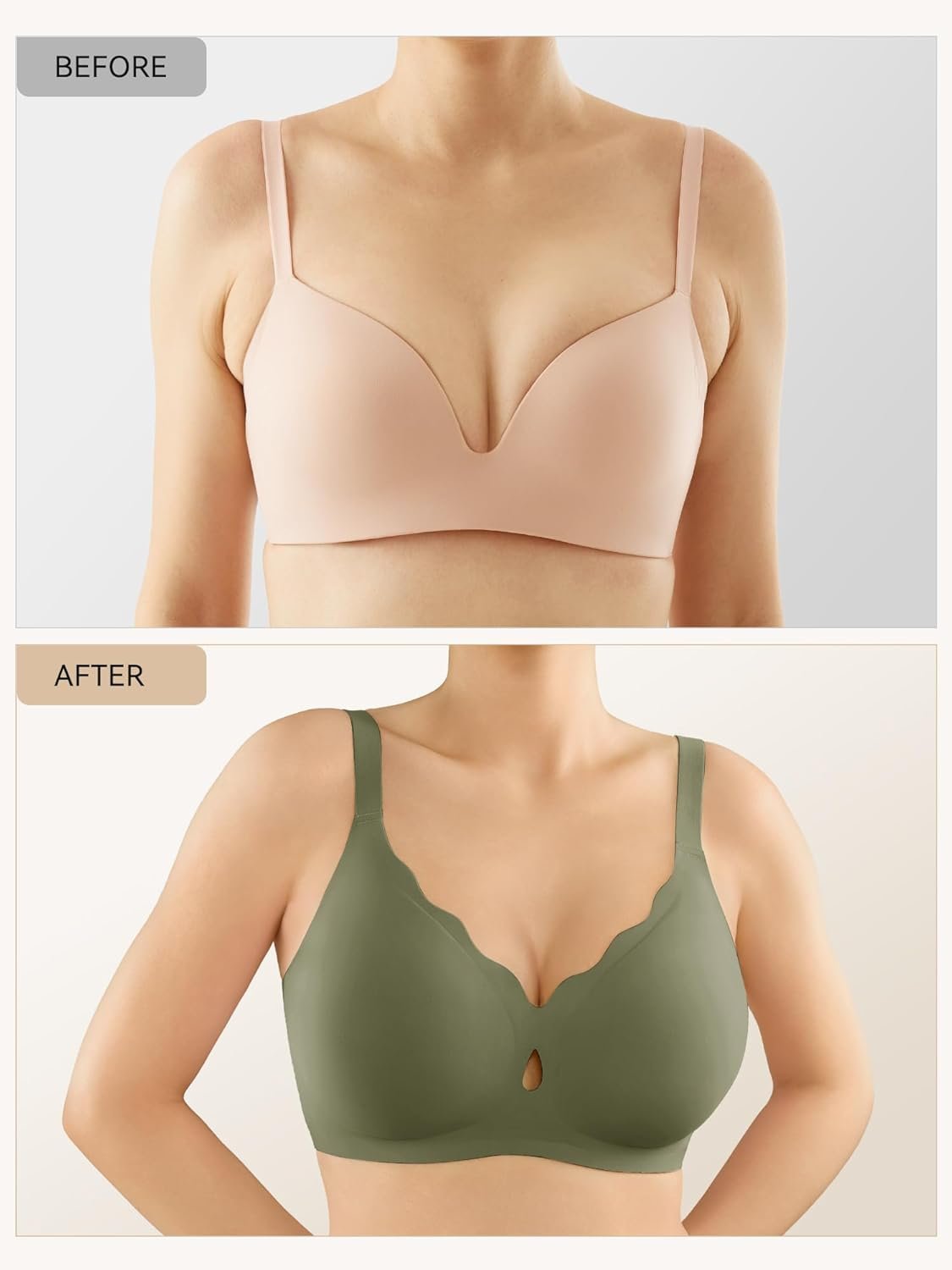 • ELEGANT WAVE AND DROP DESIGN: seamless bras feature a delicate wavy edge design that enhances natural curves and gives you a smooth, rounded silhouette. The scalloped bra edges contour gently to your bust, creating a flattering shape. The low-cut V-neckline with a water-drop design adds a feminine touch and highlights your bust. This women’s everyday t-shirt bra for women is lightweight, invisible, and non-see-through, giving you a smooth look under your clothes.