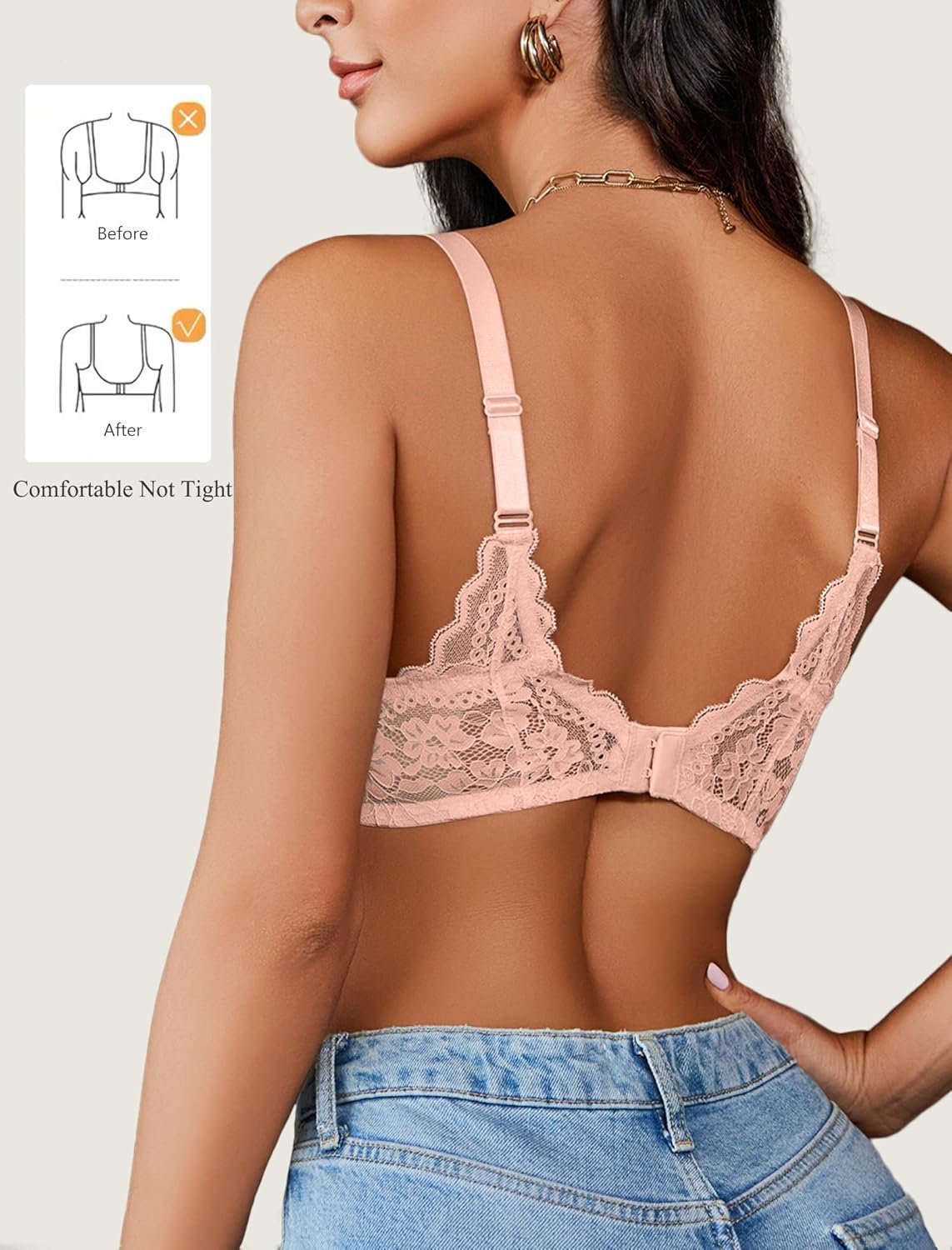 - 【Design】Full-coverage cups lace bras for women feature spaghetti strap,you can adjust to your most comfortable length, V plunging neckline with underwire can prevent sagging,you can match with open back tshirts tops, making your figure look pretty and charming.TIPS :if you have a large chest, it is recommended to buy a larger size. If you have a smaller chest, it is recommended to buy a smaller size;then adjust the back adjustment buckle to your size to ensure the right size
