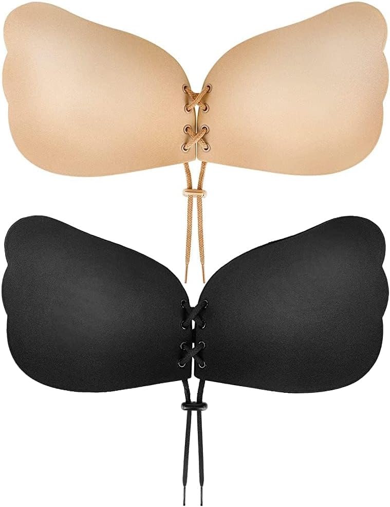 Sticky Bra, Backless Strapless Bra Push Up, Adhesive Invisible Lift Up Bras 2 Pairs Black/Beige