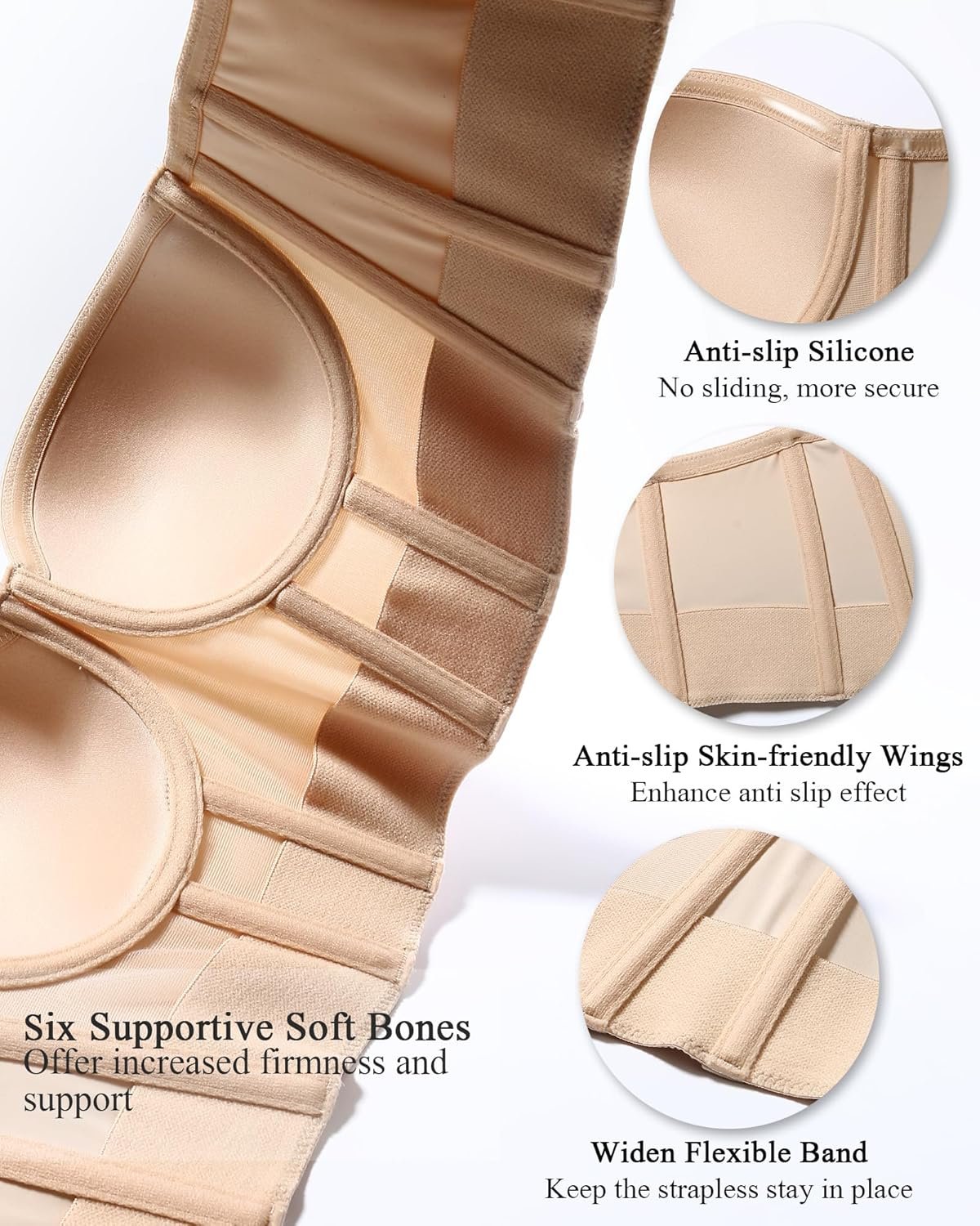 • Stay in Place: This strapless bra has anti-slip silicone, on the inner of cup and band edge, stay put for long time wearing, add chest stability. Pairs perfectly with any low-cut top or low-cut dress.