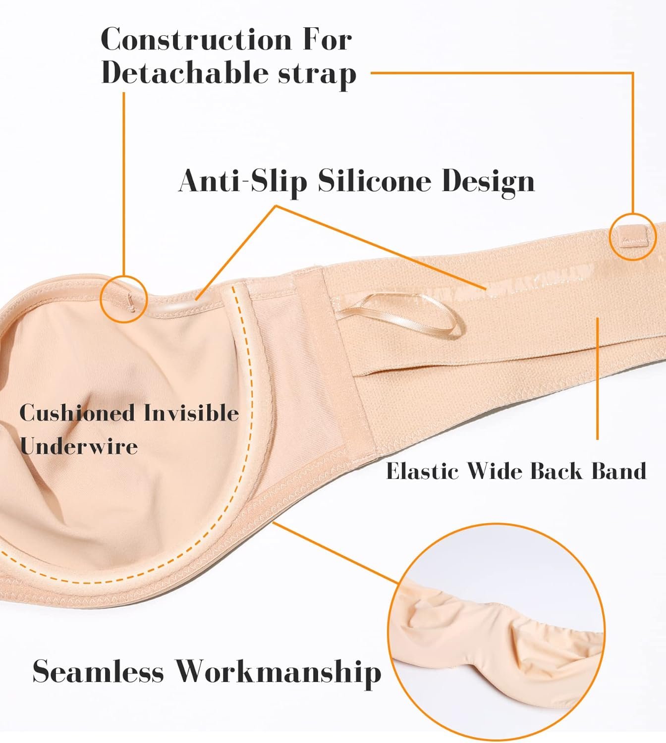 - Smooth Side and Back: Featured with wide elastic side wing and invisible side boning, this underwire strapless bra is good at smoothing side and back fat. Give you a decent look.